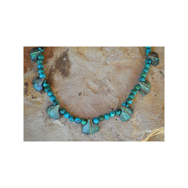 Verdigris Patina Lost Wax Cast Brass Ancestors Collection Stylized Ginkgo Leaves Necklace - Turquoise