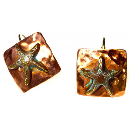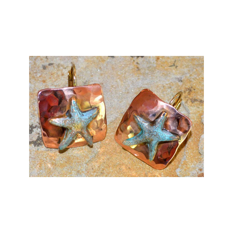 • Neo-Oceania Earrings featuring highly detailed Starfish in Verdigris Patina Brass on Hand Hammered domed square backgrounds of Pure Copper shown with Museum Latch (Pierced) Closures.