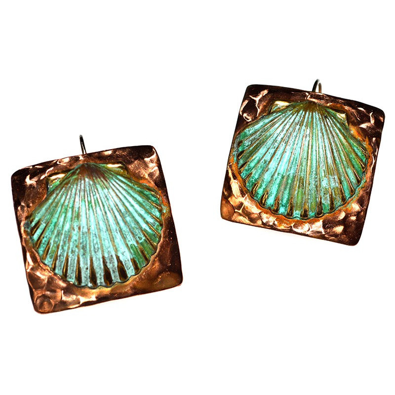 • Neo-Oceania Earrings featuring Iconic Scallop Shells in our multi-tone Verdigris Patina Brass on Hand Hammered domed square backgrounds of Pure Copper shown with Museum Latch (Pierced) Closures.